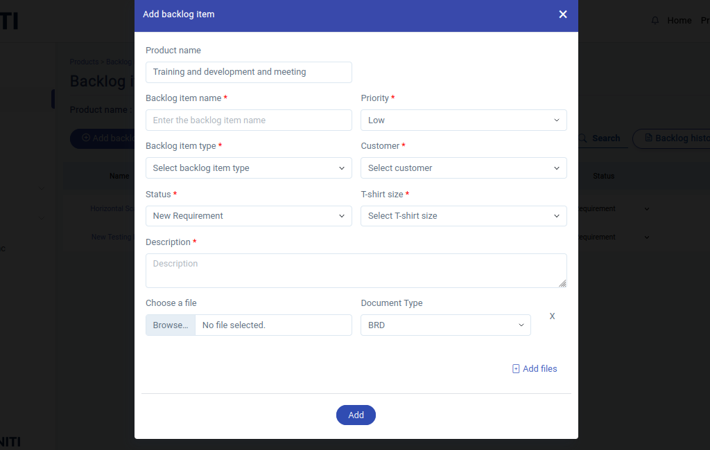 - By clicking the add files one can able to add BRD documents , Test case document , Technical document for a particular backlog item.