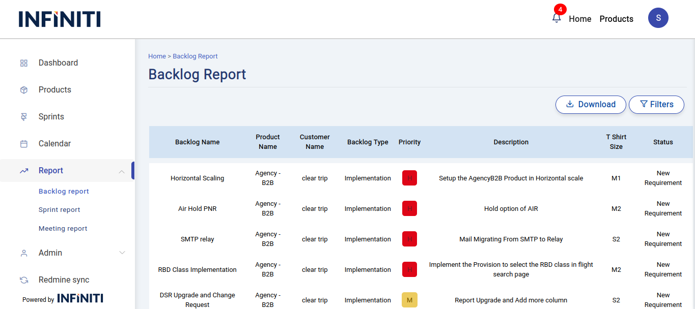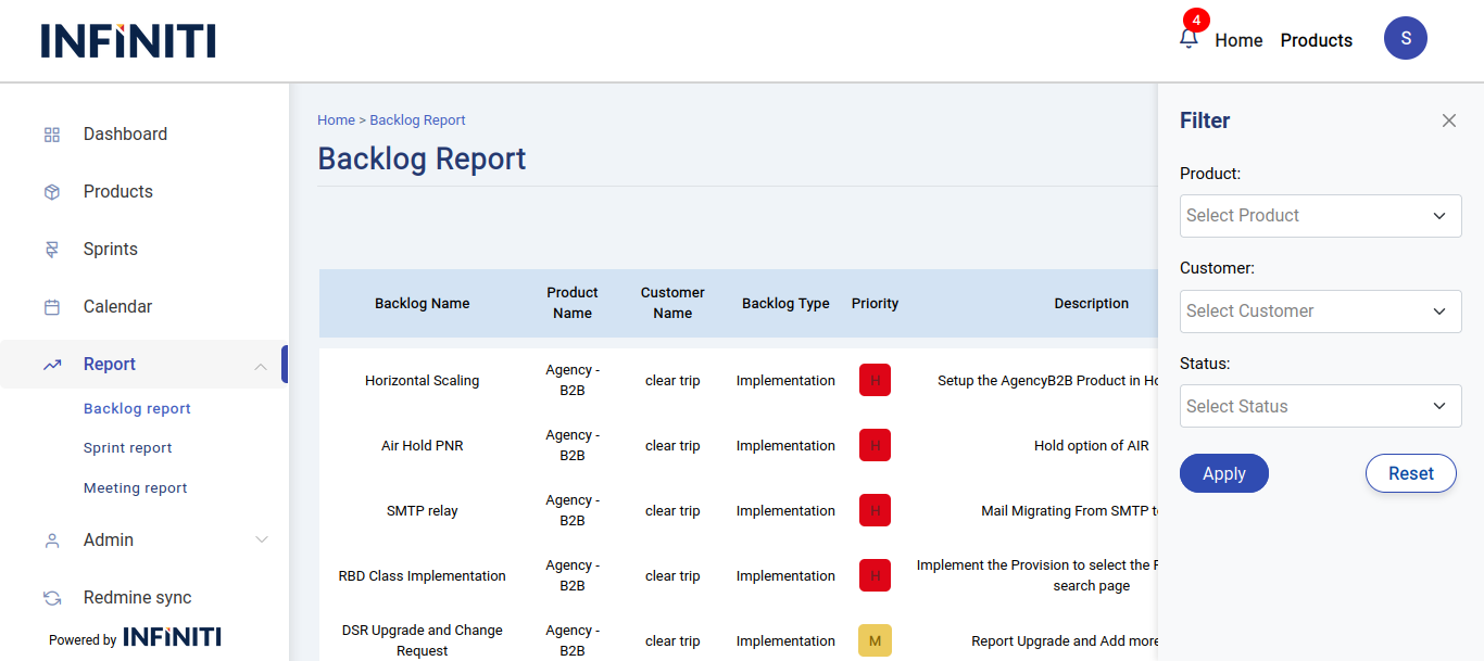 - When the user clicks the “Apply” button, the report updates to show only the backlog items that match the selected filter criteria.