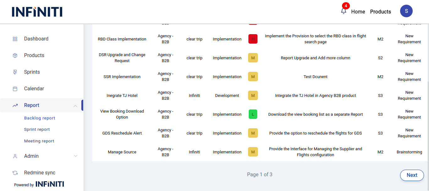 The backlog report displays backlog details specific to the user’s products, providing comprehensive information about each backlog item. It includes a filter option to refine the backlog details and pagination to navigate through the records, showing 10 entries per page.