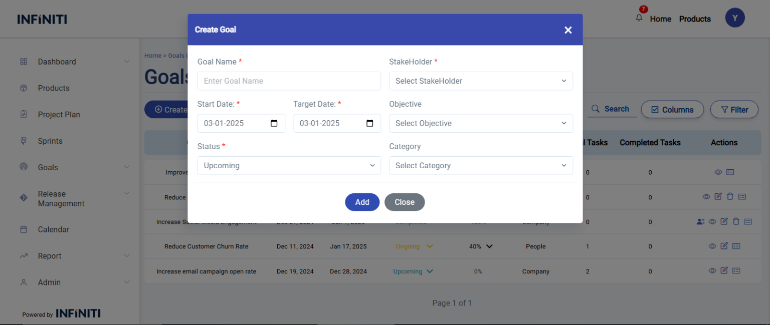 • Stakeholder – Drop-down list to select the stakeholder of the Goal.