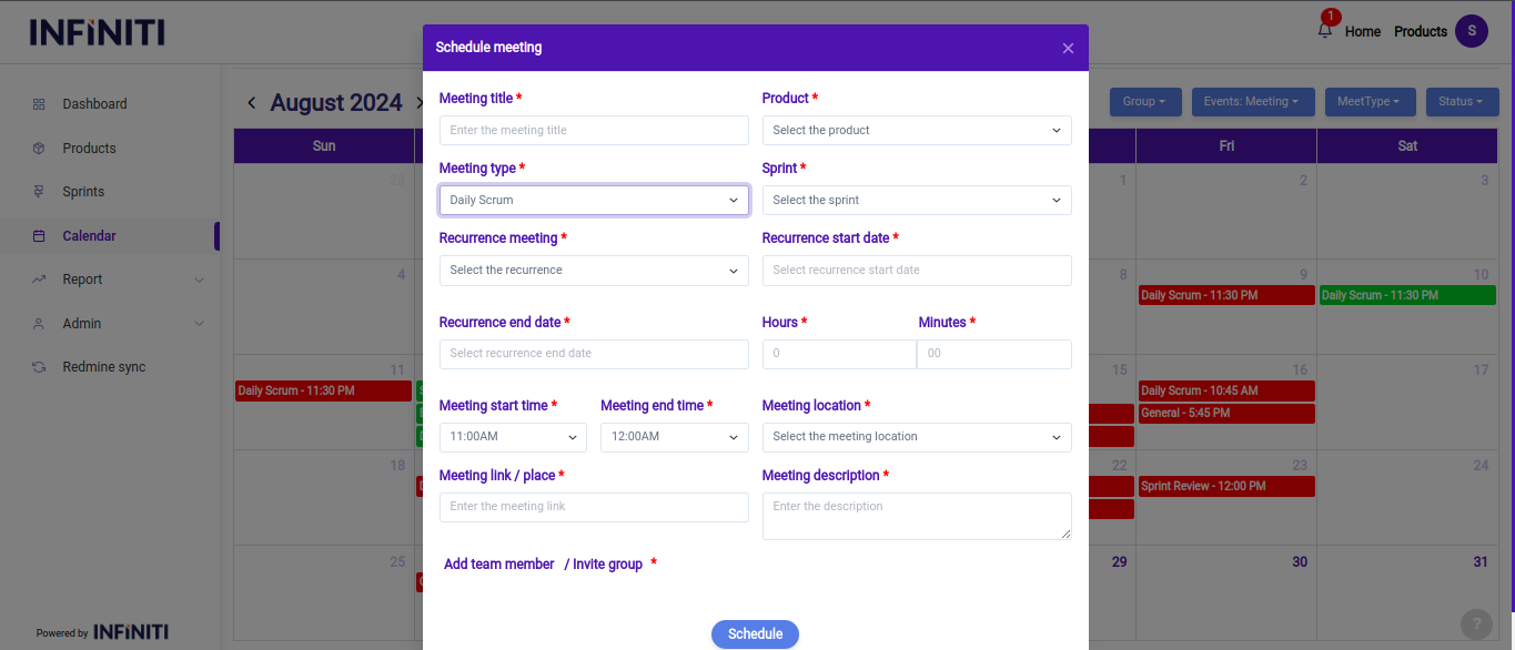 • Product: The product associated with the meeting is selected from a dropdown list, ensuring the meeting is relevant to the specific project or product under development.