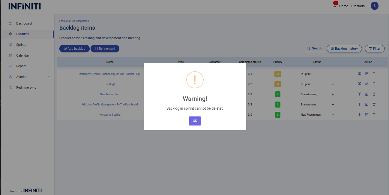- If the user tried to delete a backlog item which is in the status “In sprint” a warning popup will be shown displaying “This item is currently running and it can’t be deleted”.