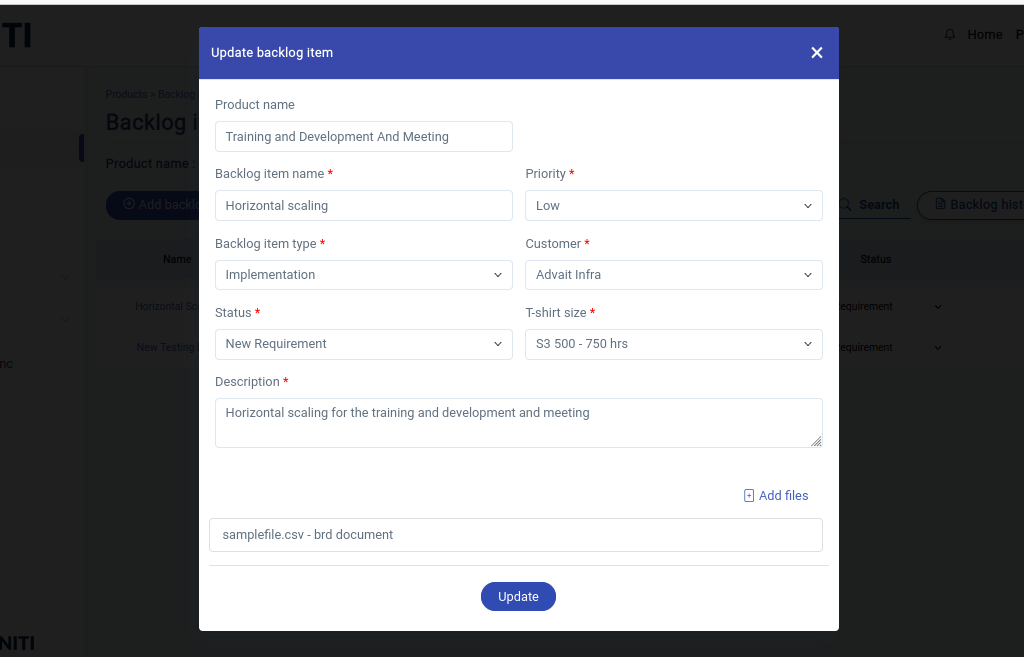• In the Edit backlog form the files attached with the corresponding backlog item will be shown.One can able to add new files for the backlog item.