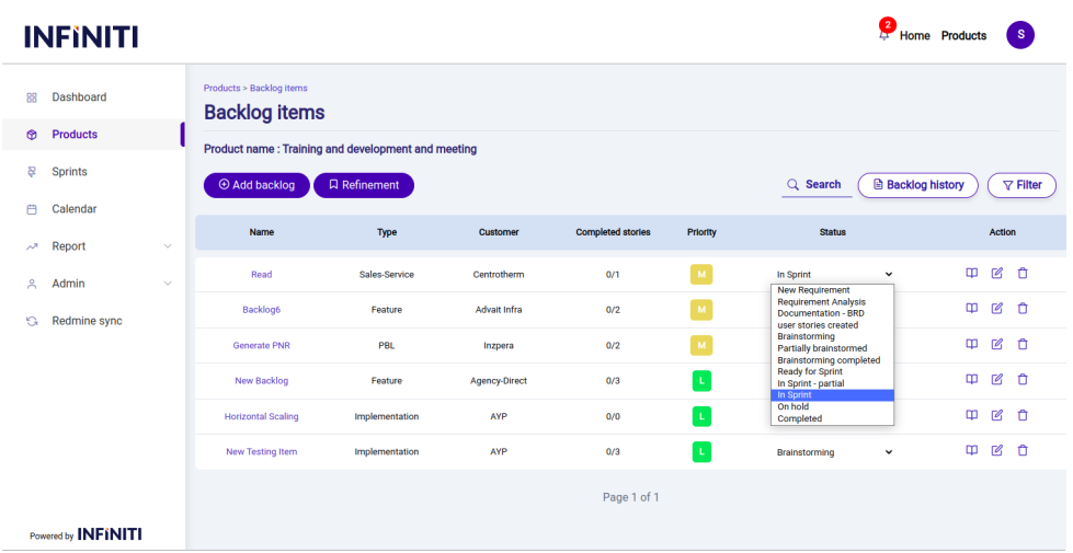 • By clicking the drop down all the status of the backlog item will be listed from that user can choose the status which he/she wants to change.