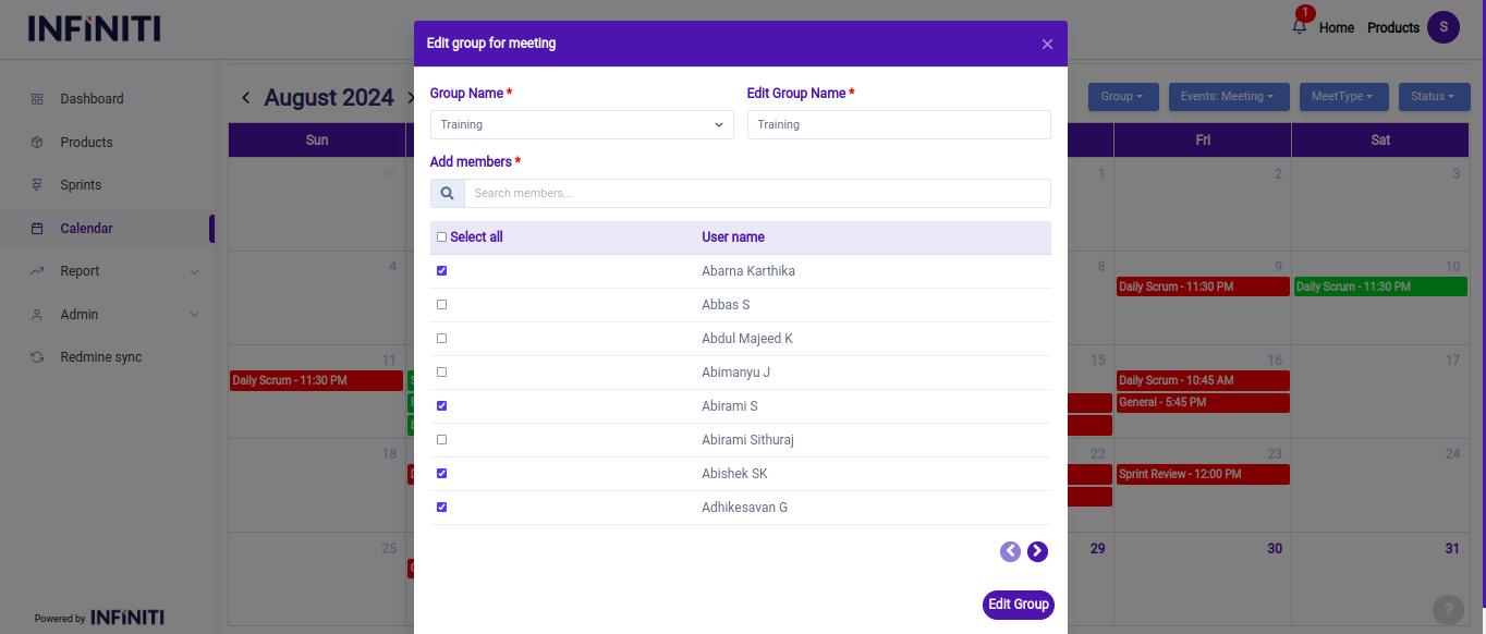 - Once a group is selected, the system displays the current members of that group with their checkboxes pre-selected. This allows users to see which members are already part of the group and make adjustments as needed.