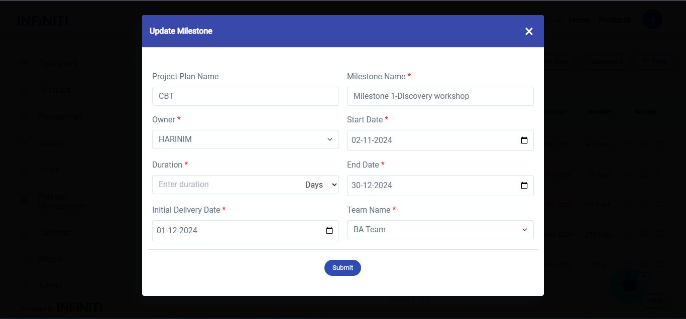 Features of Edit Milestone:If there is a need to update or correct a milestone, the system allows editing of the milestone. The process is similar to the “Add Milestone” workflow.