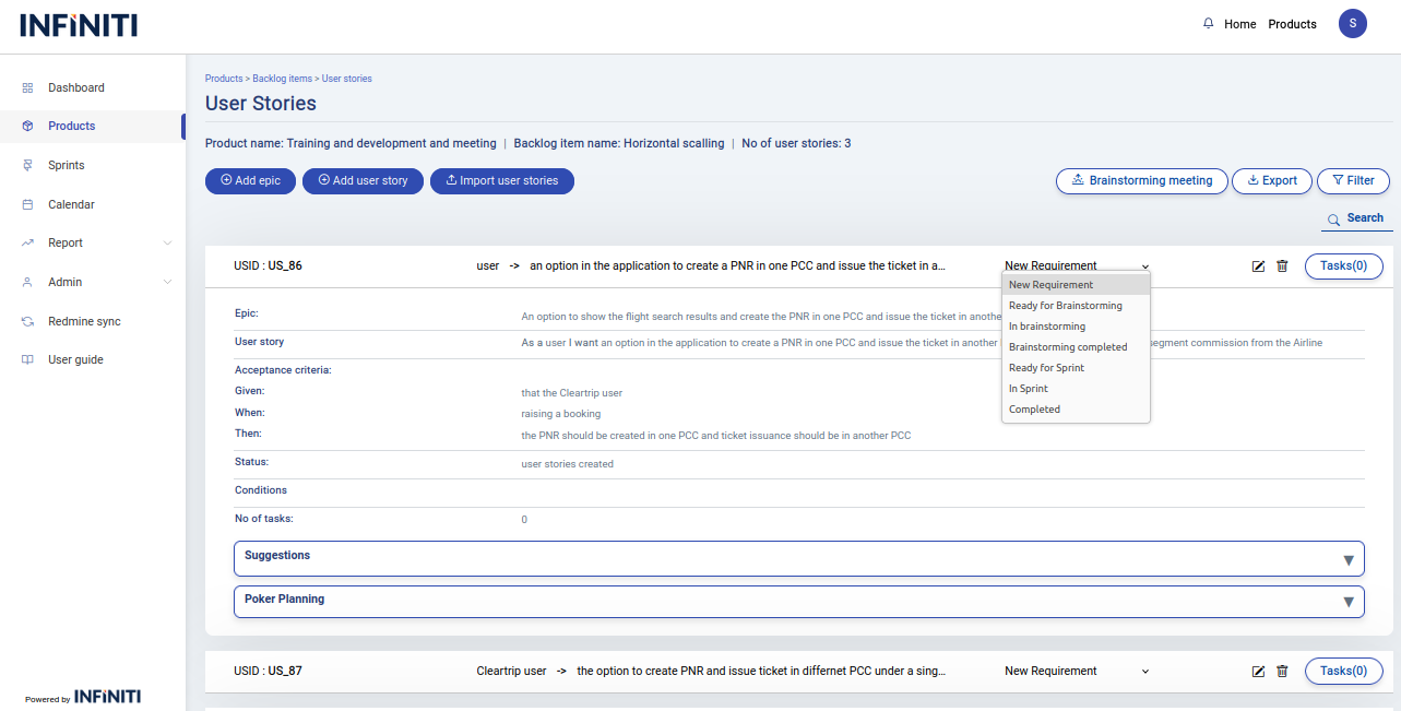 - By clicking the drop down the list of all the user story status will be displayed and we can choose and update the status.