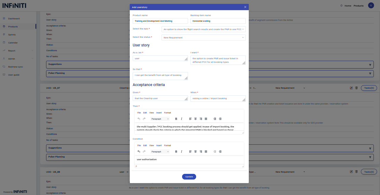 - All the details of the user story will be auto populated in the form from which the user can update the field which he/she wants to change.
