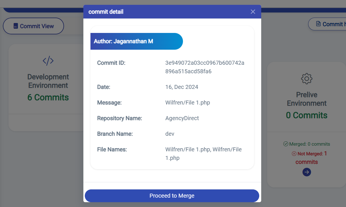Use the Proceed to Merge button to navigate to the next page(Commit Details) for: Cherry-picking commits / Merging changes sequentially.
