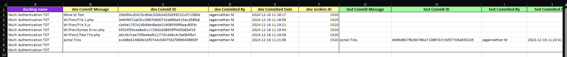 By clicking the Commit Report, you can view detailed information about the commits across the branches with commit message their author, and the date.