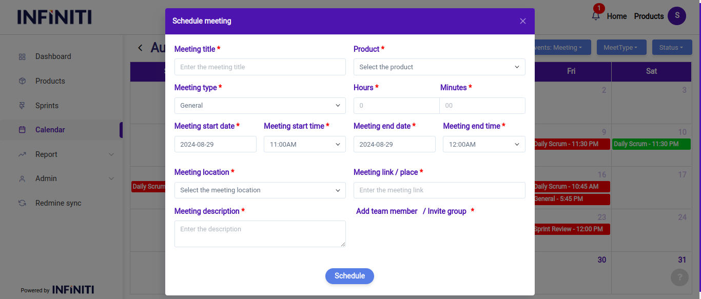 i. If the user selects “General” as the meeting type, they will need to fill out all mandatory fields such as the meeting title, date, time, members and any other required details before clicking the “Schedule button” to confirm the meeting.