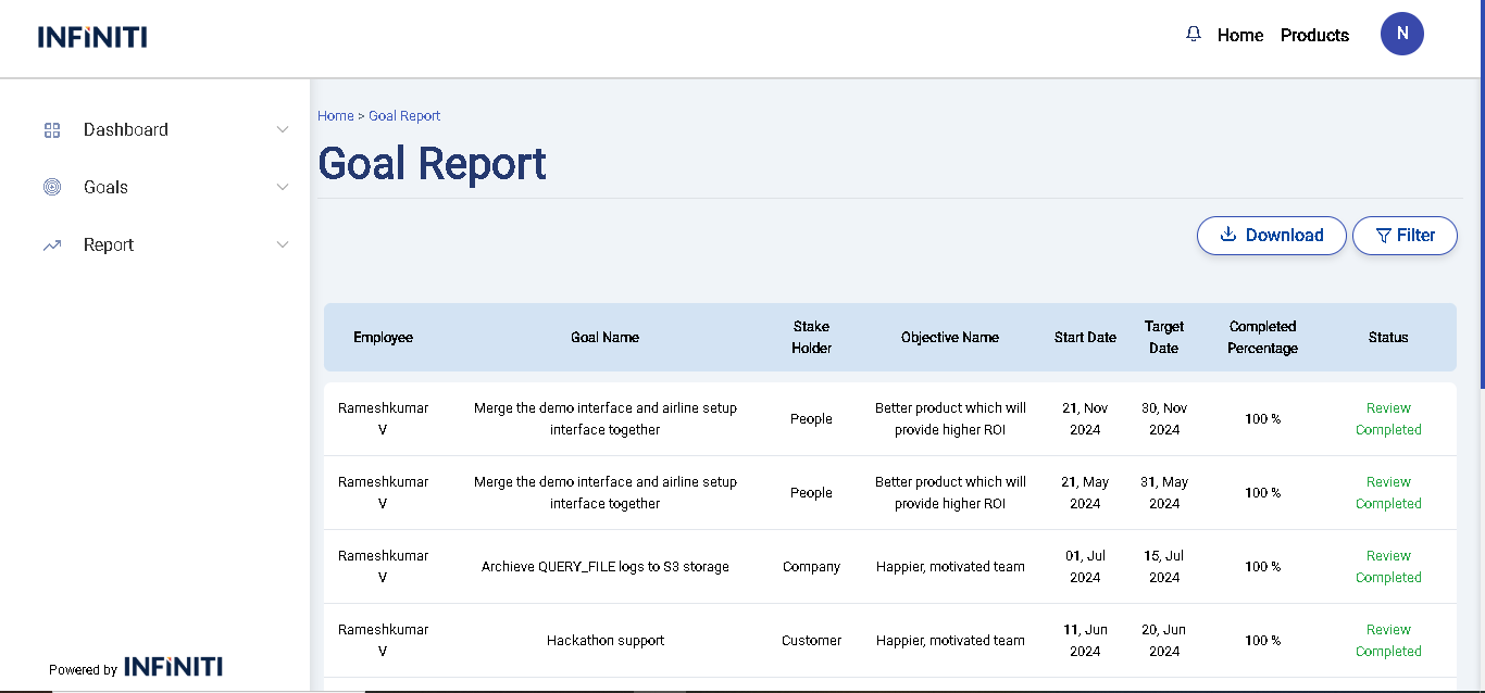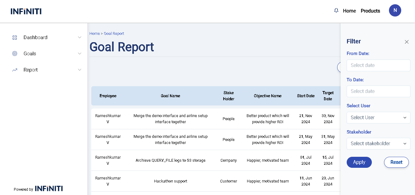 • When the user clicks the “Apply” button, the report updates to show only the goals that match the selected filter criteria.