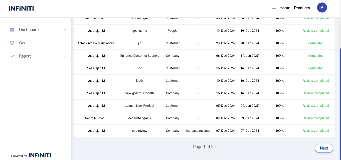 The goal report displays detailed information about each user’s goals, providing comprehensive insights into progress and performance. It includes a filter option to refine the displayed goals and pagination to easily navigate through the records, showing 10 entries per page.
