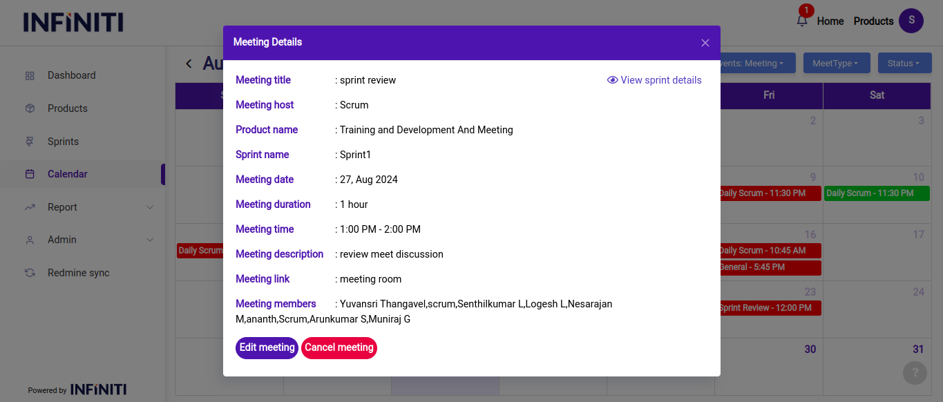 • Upon clicking on a scheduled meeting, users are presented with all the relevant details, including the meeting title, date, time, location, participants, agenda, and any additional notes or attachments.
