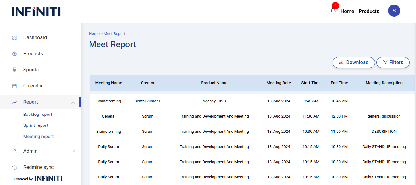 The meeting report displays meeting details specific to the user’s products, offering comprehensive information about each meeting. It includes a filter option to refine the meeting details and pagination to navigate through the records, showing 10 entries per page.