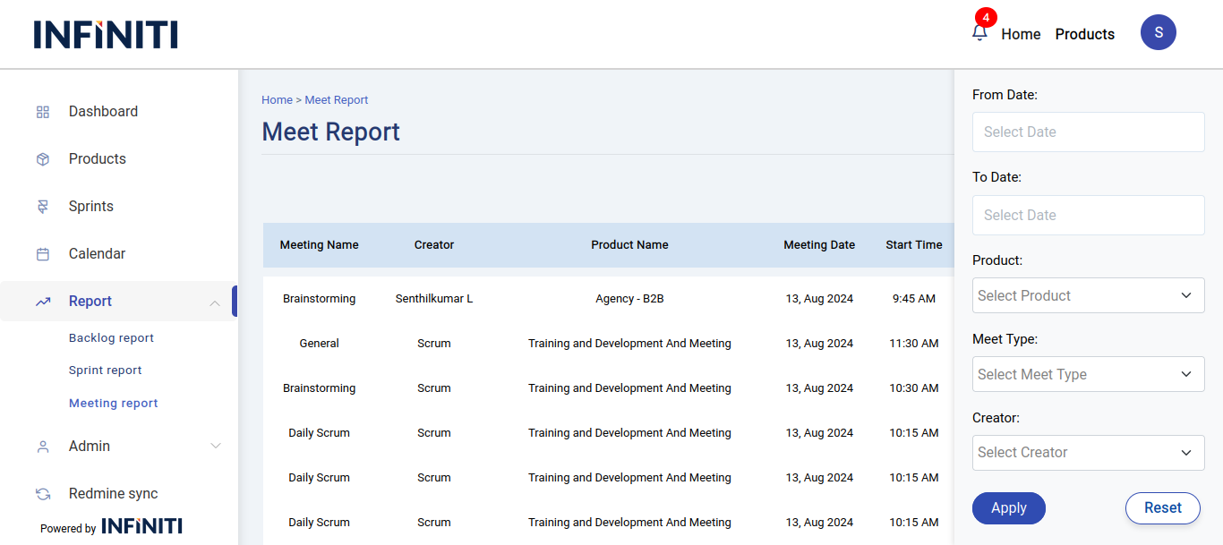 - When the user clicks the “Apply” button, the report updates to display only the meetings that match the selected filter criteria.
