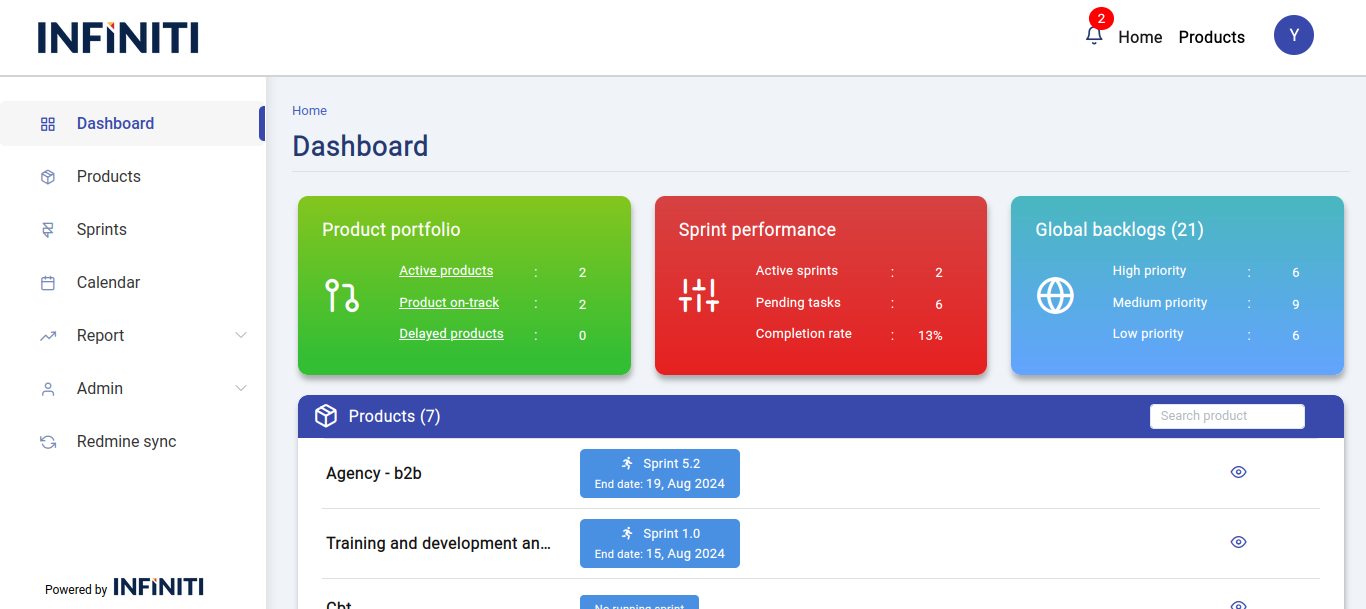 The multiple product dashboard page shows the overall product details for the user. This page displays active products, highlighting those that are delayed or on track, along with active sprints, pending tasks with their completion percentage, and incomplete backlogs with priority.