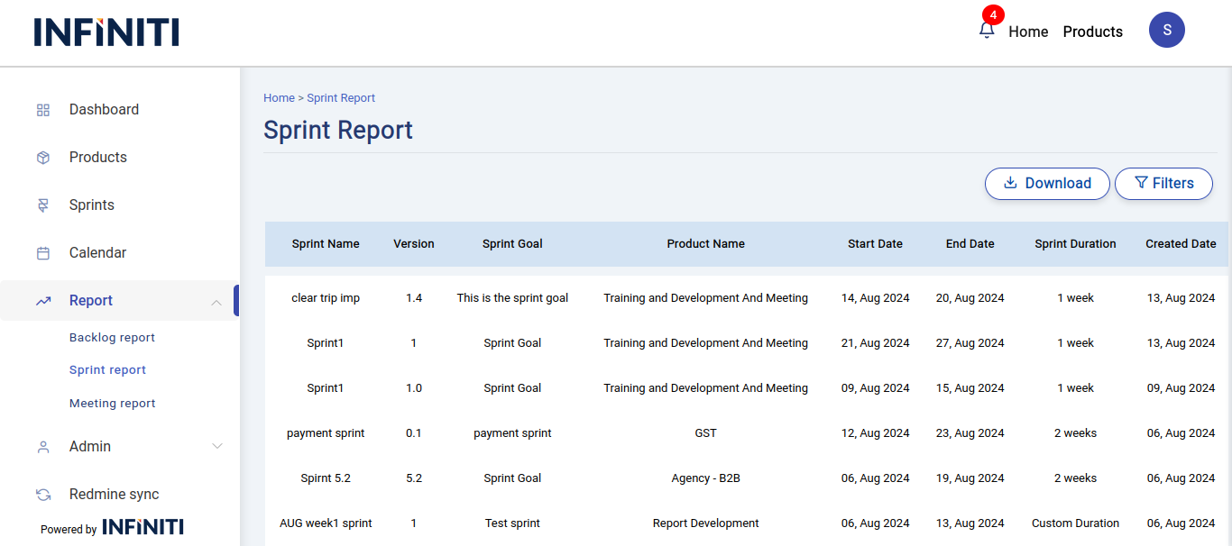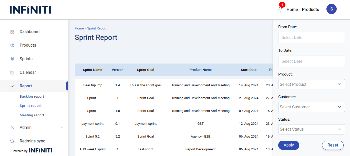 The sprint report displays sprint details specific to the user’s products, providing comprehensive information about each sprint. It includes a filter option to refine the sprint details and pagination to navigate through the records, showing 10 entries per page.