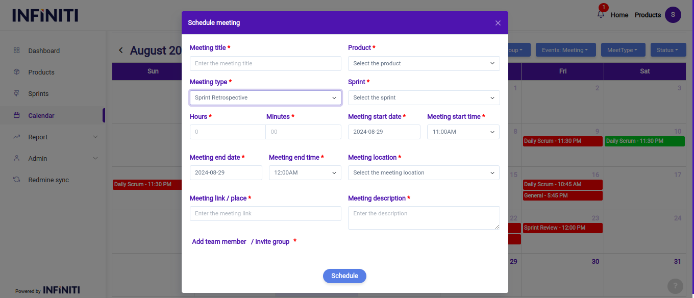 In this scenario, when a user selects the present date in the calendar, a modal will appear where they can create a new “Sprint Retrospective meeting”.