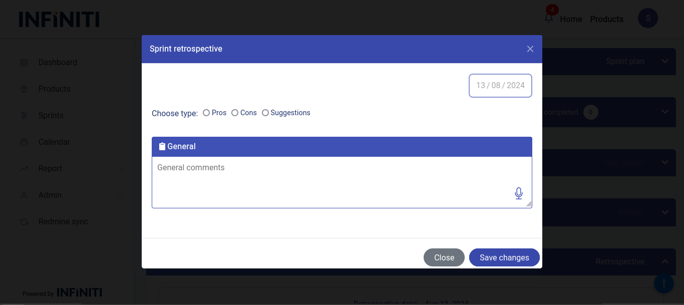 The Sprint retrospective page is used to insert retrospective details for the sprint, by clicking the ‘Sprint Retrospective’ button the below modal is opened.