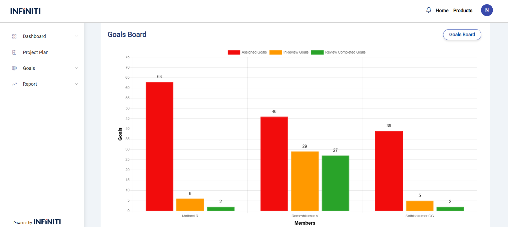 - Displays the employees Assigned Goals, In Review Goals, Review Completed Goals in the bar chart view who are comes under the Manager.